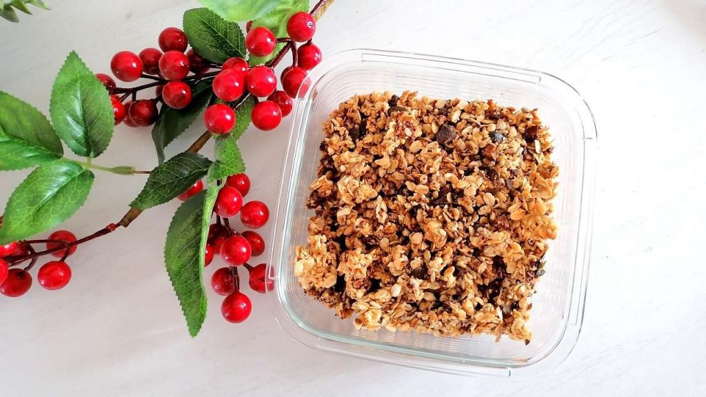 Per preparare la granola di nocciole ho scelto di sostituire le mandorle e aggiungere l’uva passa. Una variante potrebbe prevedere le bacche di Goji al posto dell’uvetta, o ancora dei mirtilli essiccati. Ho anche modificato la quantità di semi, per adattarla al sapore che intendevo ottenere, ovvero più dolciastro. Conservatela in un contenitore a chiusura ermetica per conservarla al meglio per circa 15 giorni. Occorrente da cucina: