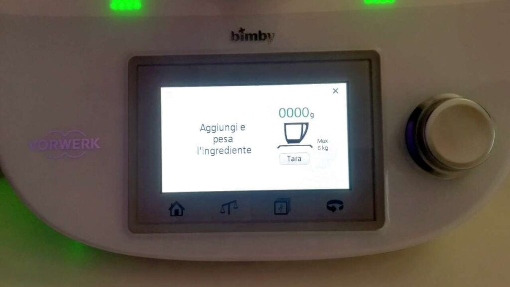 La bilancia Bimby si attiva premendo l’icona apposita sul display. Gli ingredienti possono essere pesati all’interno nel boccale o dentro un recipiente da posare sul coperchio o sul Varoma. I passaggi sono: