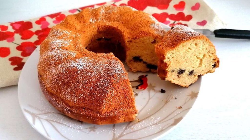 - Riempite lo stampo per ciambella con metà dell’impasto. Se gradite al centro mettere delle gocce di cioccolato. Ricoprite con la restante parte.
