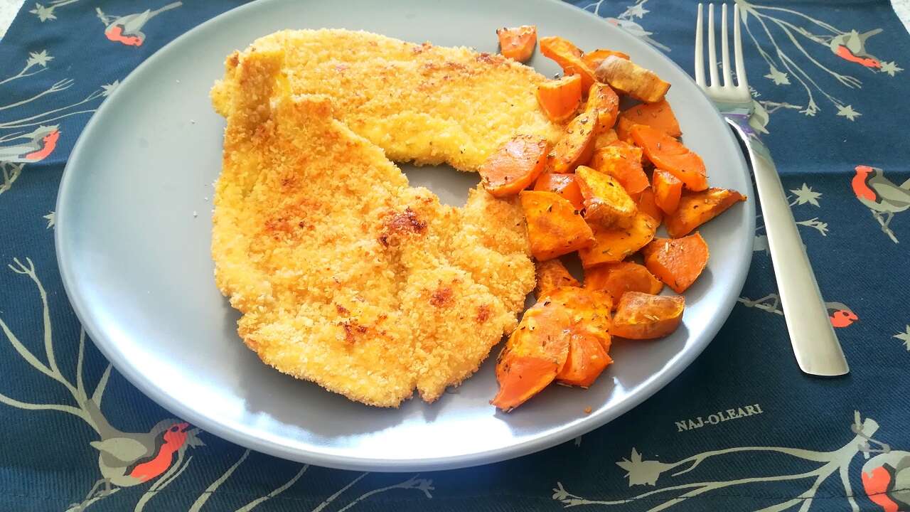 - Servite calde, accompagnate da un contorno (io ho scelto patate dolci al forno).