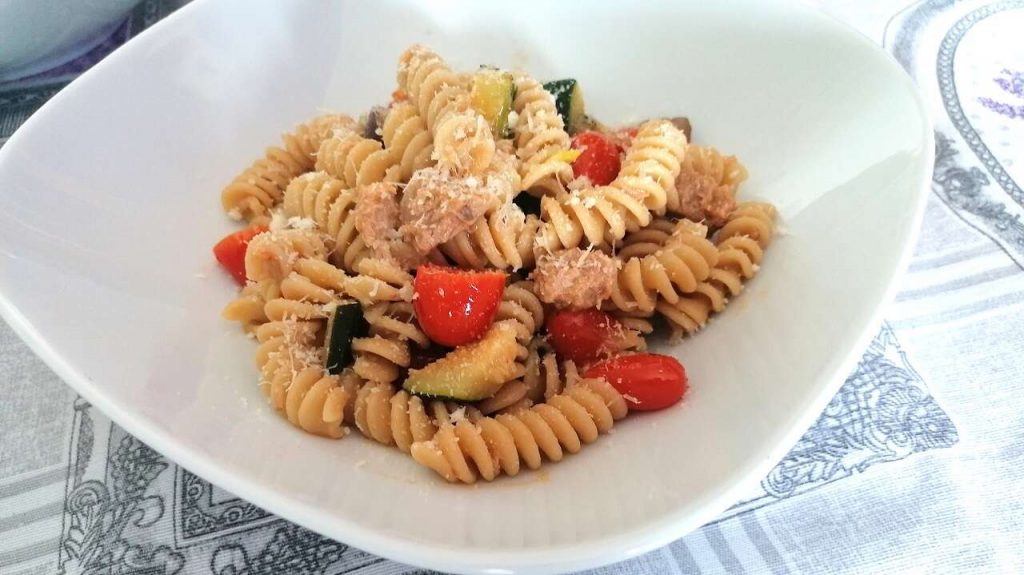 La ricetta della pasta con tonno, pomodorini e zucchine me la sono un po’ improvvisata, con quello che avevo in casa e all’ultimo minuto. Ma il risultato è stato gradito, anche da chi mi ripete ‘le zucchine non mi piacciono’. Sarà anche per questo che mi invento sempre il modo di fargliele mangiare 😀 . La mia pasta, come si nota dal colore, è come sempre integrale (sono ormai rare le occasioni in cui la mangio bianca). Detto questo, scegliete pure quella che preferite.