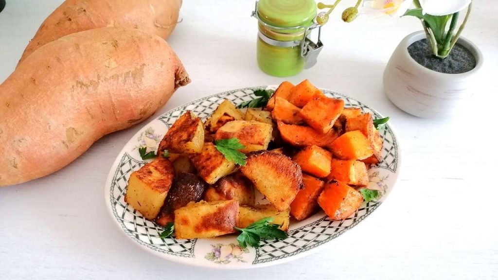 Per andare incontro alle esigenze di tutta la famiglia, è mia abitudine preparare le patate miste al forno. In altre parole, nella teglia faccio un mix di patate classiche e patate dolci, o americane. Per dar un tocco di colore scelgo quelle arancioni, ma se vi piacciono di più, potete optare anche per quelle bianche o viola. Prepararle è davvero un gioco da ragazzi/e.