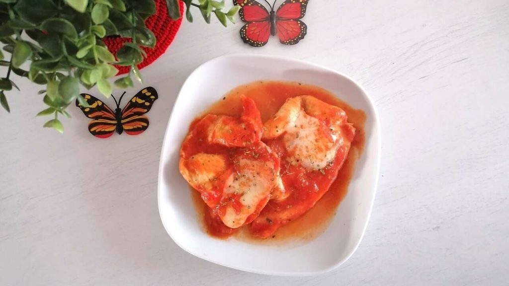 Ho preparato il petto di pollo al sugo di pomodoro un giorno che avevo fretta, ma non mi andava il pollo arrostito in padella. Ho pensato di fare una specie di pizzaiola, ma mi son limitata a quello che mi trovavo in casa, per cui ho omesso patate e olive. Devo ammettere che il sapore non cambia di molto, per cui se avete fretta, è una scelta valida da prendere in considerazione.