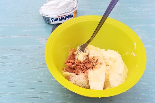 - Mettete tonno ben sgocciolato, philadelphia, parmigiano e pangrattato (se volete usarlo) in una ciotola e amalgamate bene con una forchetta.
