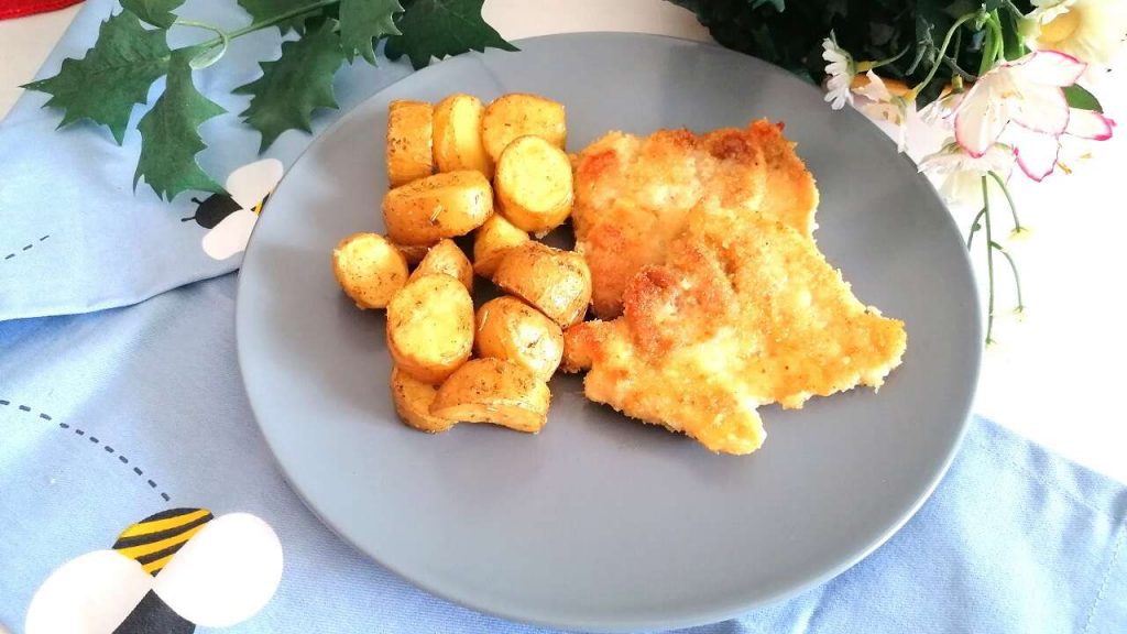 - Le sovracosce di pollo impanate con patate novelle sono pronte.
