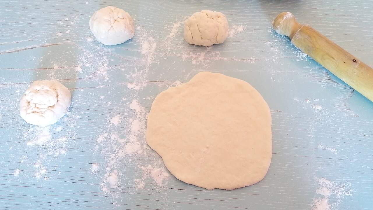 - Dividete l’impasto in 4 o più parti e stendetelo in uno spessore di circa 3 mm formando delle focaccine rotonde.