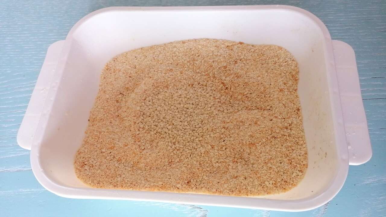 - Preparate il pangrattato per la panatura, miscelandolo con semi di sesamo, formaggio, sale e pepe.